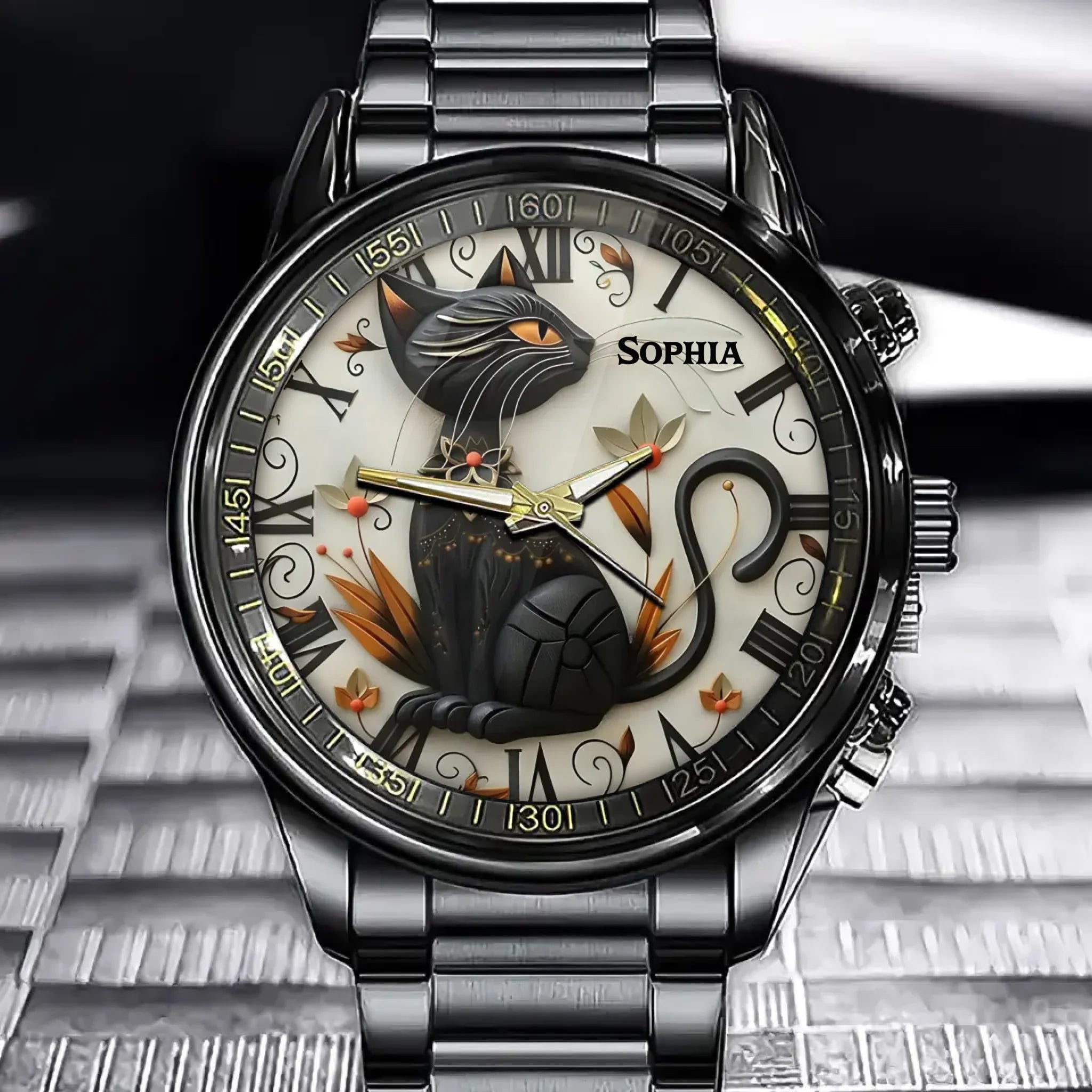 Personalized Vintage Embossed Black Cat Watch - With Roman Numeral Dial & Floral Accents