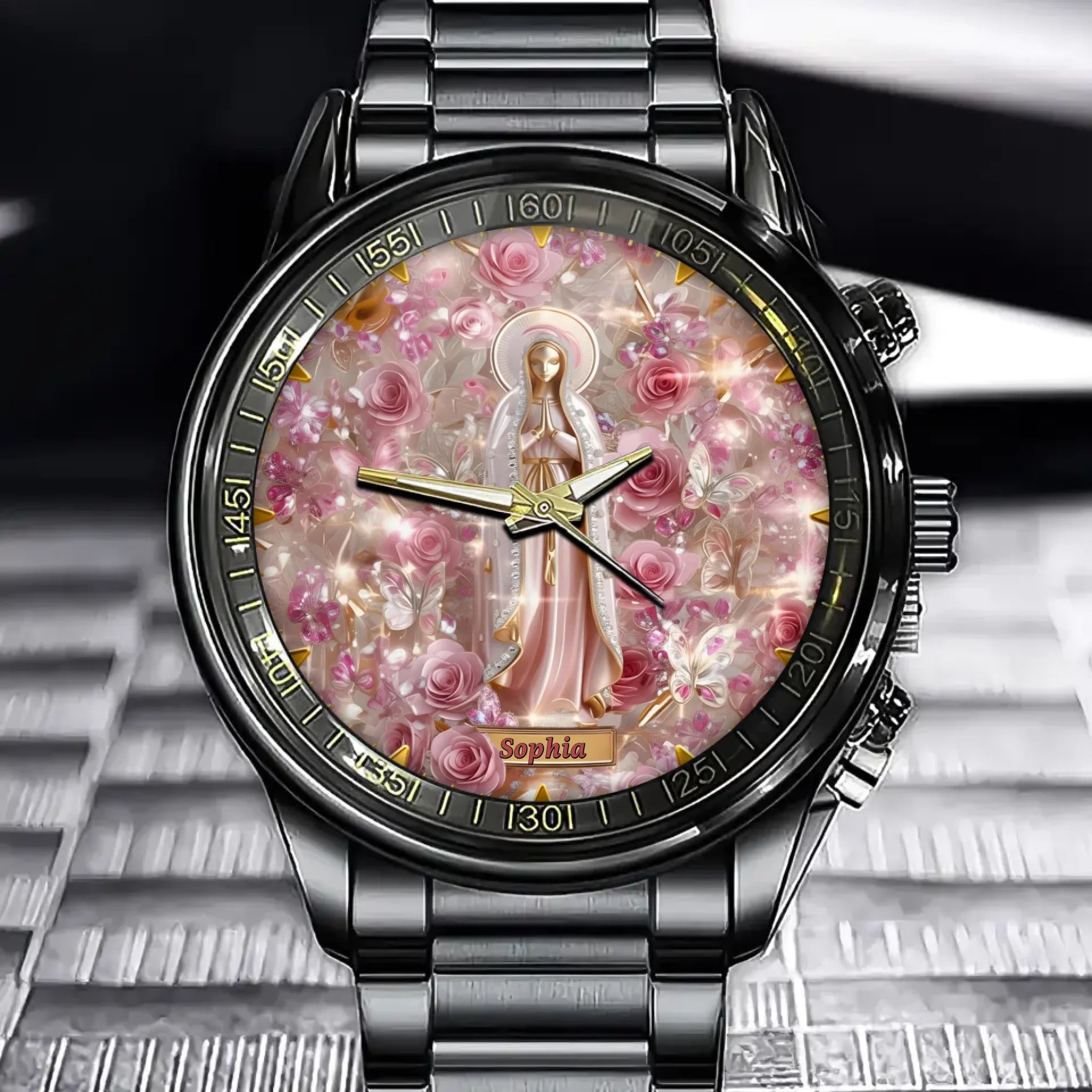 Personalized Virgin Mary Watch – Custom Name Dial, Pink Rose Floral Faith Gift